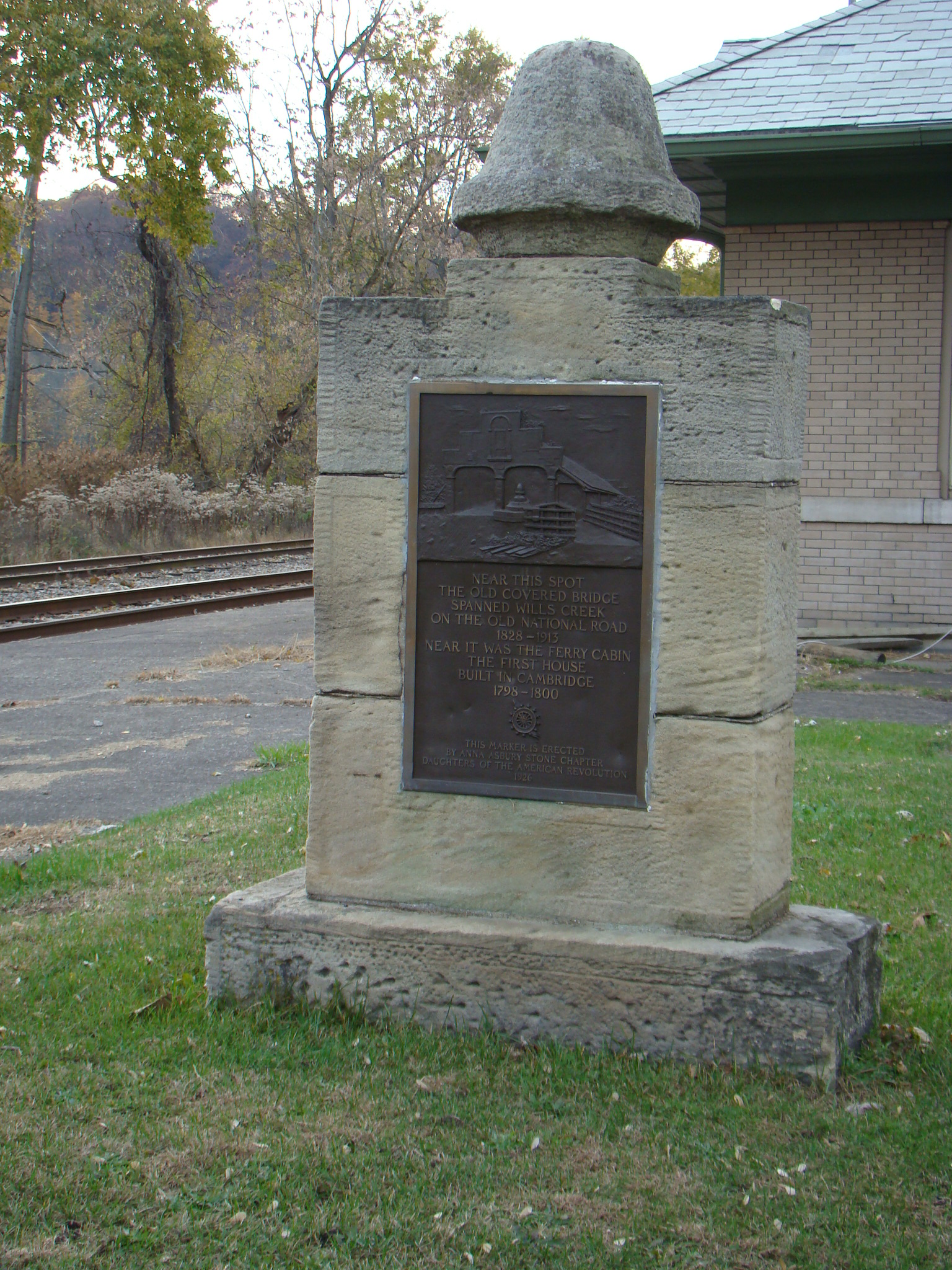 Crossing Wills Creek near the station, was the original Double Covered Bridge that carried people and animals down the Old National Trail from 1828-1913. That early bridge was somewhat dangerous to cross as the timbers often were displaced by floods, causing the bridge to frequently lean. Cost to cross the bridge was twelve cents. Soon nearby, a tavern and hotel were built and Cambridge got its beginnings.